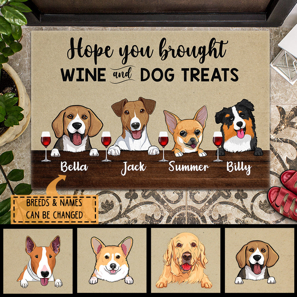 Hope You Brought Wine And Dog Treats, Beige And Dark Brown Background, Personalized Dog Lovers Doormat