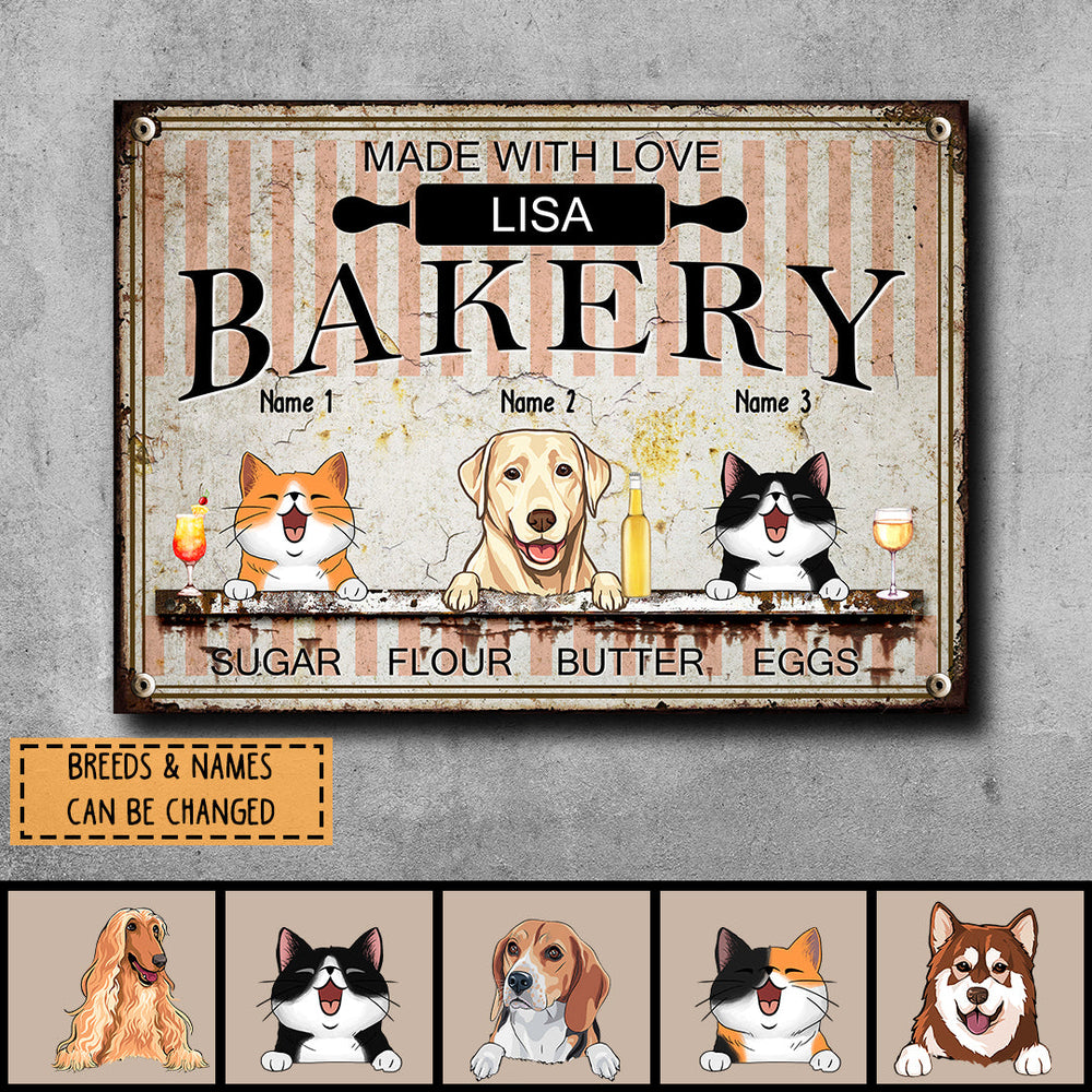 Metal Bakery Sign, Gifts For Pet Lovers, Made With Love Sugar Flour Butter Eggs Personalized Metal Signs