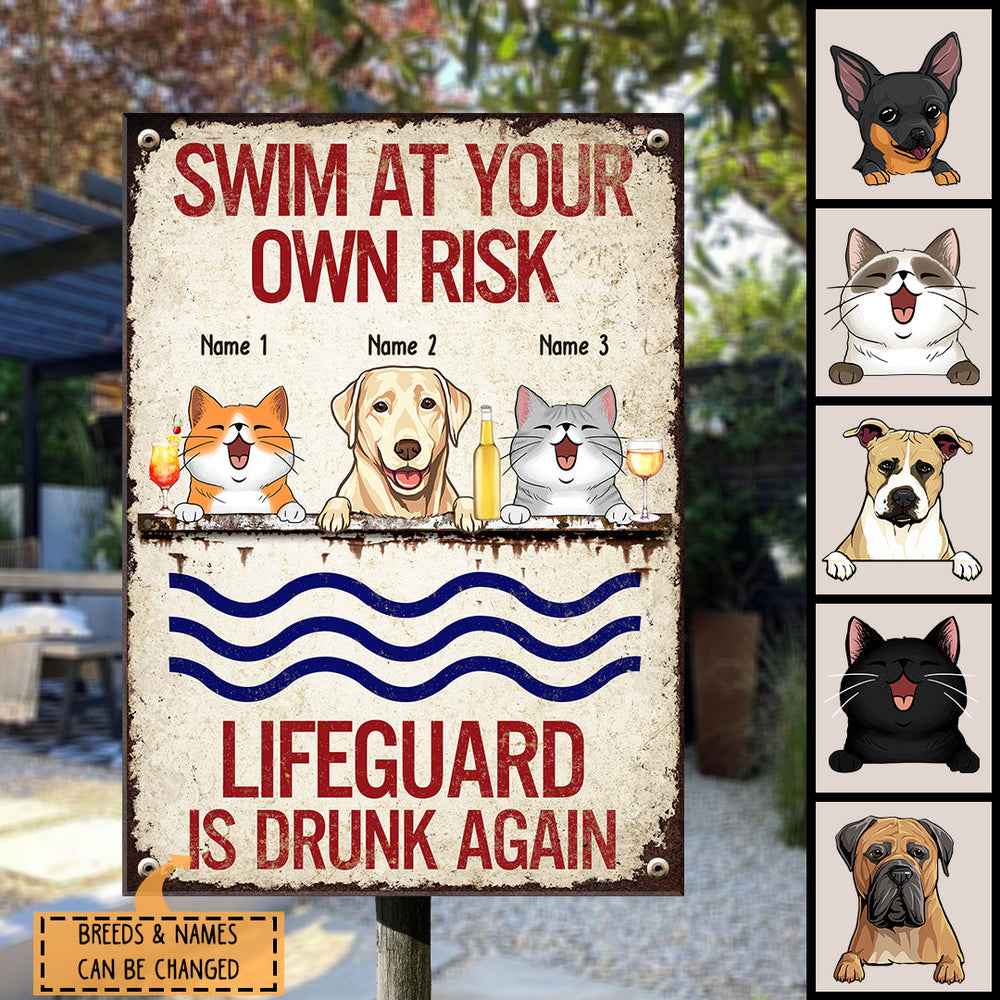 Metal Pool Sign, Gifts For Pet Lovers, Swim At Your Own Risk Lifeguard Is Drunk Again Funny Warning Signs