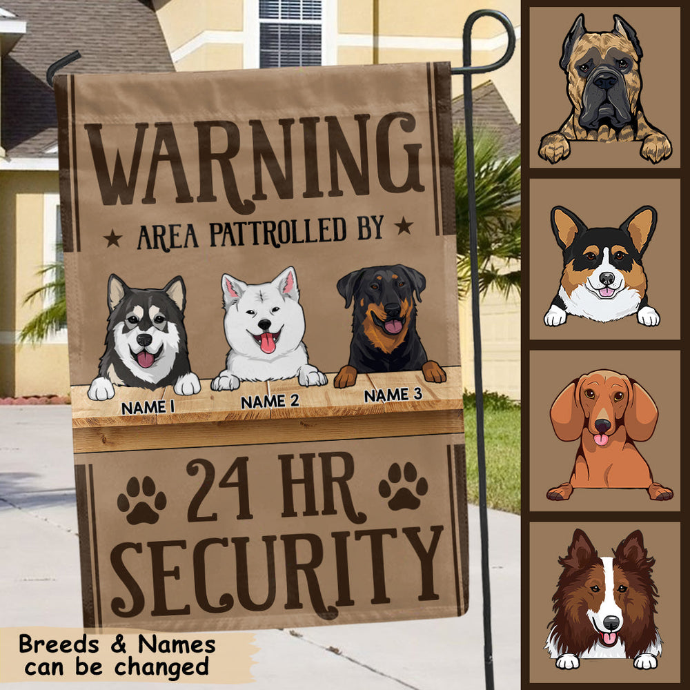 Personalized Dog Breeds Garden Flag, Gifts For Dog Lovers, Warning Area Patrolled By 24 HR Security