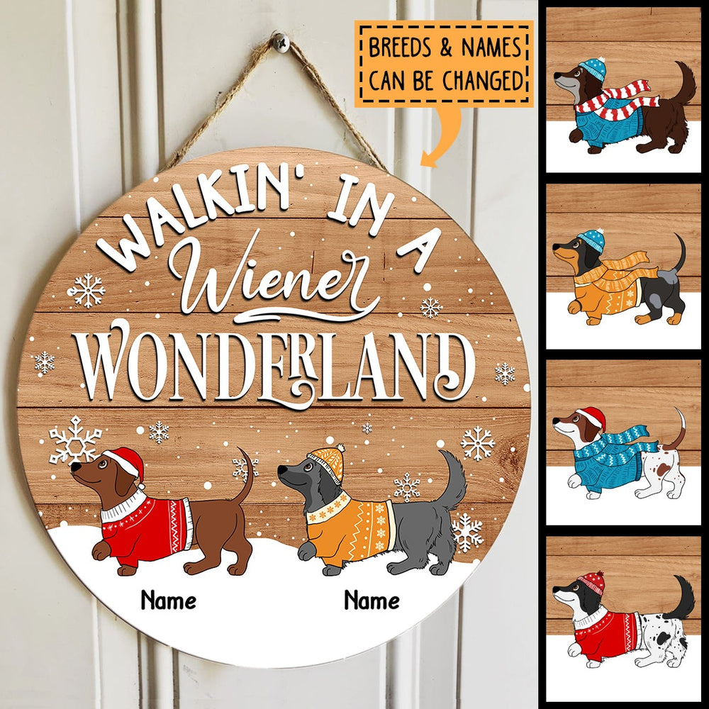 Walkin' In A Wiener Wonderland - Dachshund In Snow - Pale Wooden - Personalized Dog Christmas Door Sign