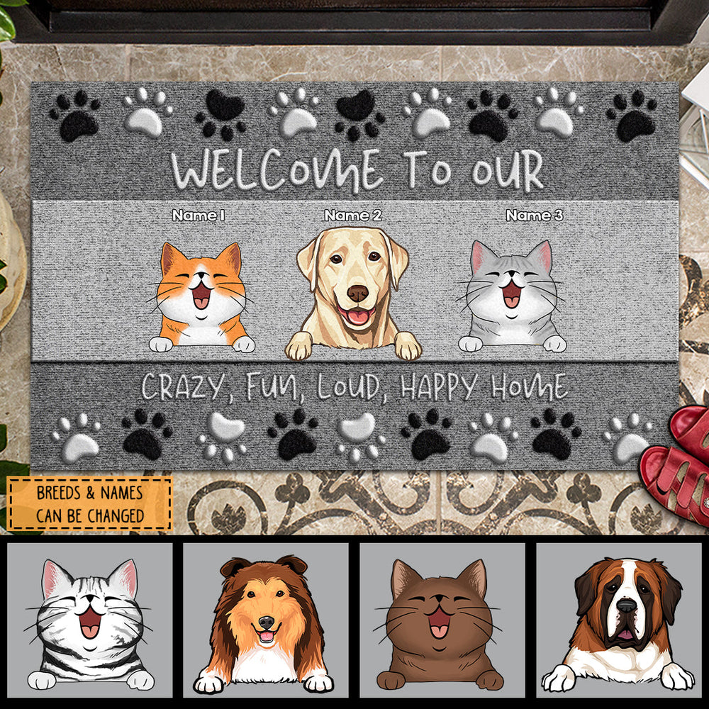 Welcome To Our Crazy Fun Loud Happy Home, Black And White Pawprints, Personalized Dog & Cat Doormat, Pet Lovers Gifts