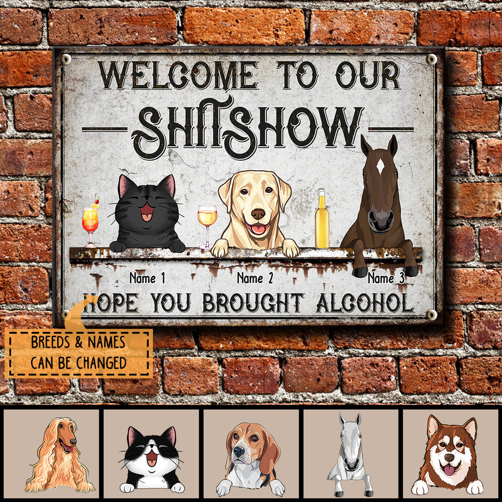 Welcome To Our Shitshow, Hope You Brought Alcohol, Laughing Pets & Beverages, Personalized Cat & Dog & Horse Lovers Metal Sign