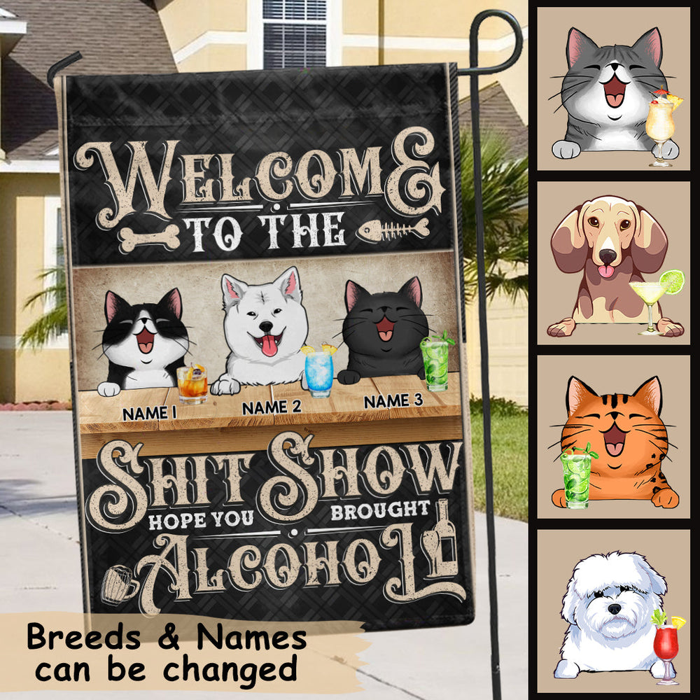 Welcome To The Shitshow Hope You Brought Alcohol, Black Background, Personalized Cat & Dog Breeds Garden Flag
