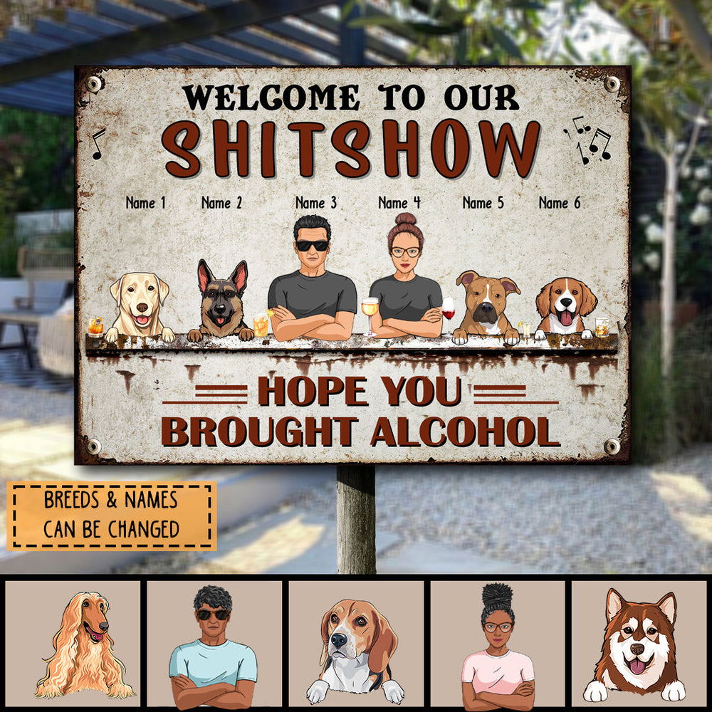 Welcome To The Shitshow Hope You Brought Alcohol, Couple & Dogs, Personalized Dog Breeds Metal Sign, Dog Lovers Gifts
