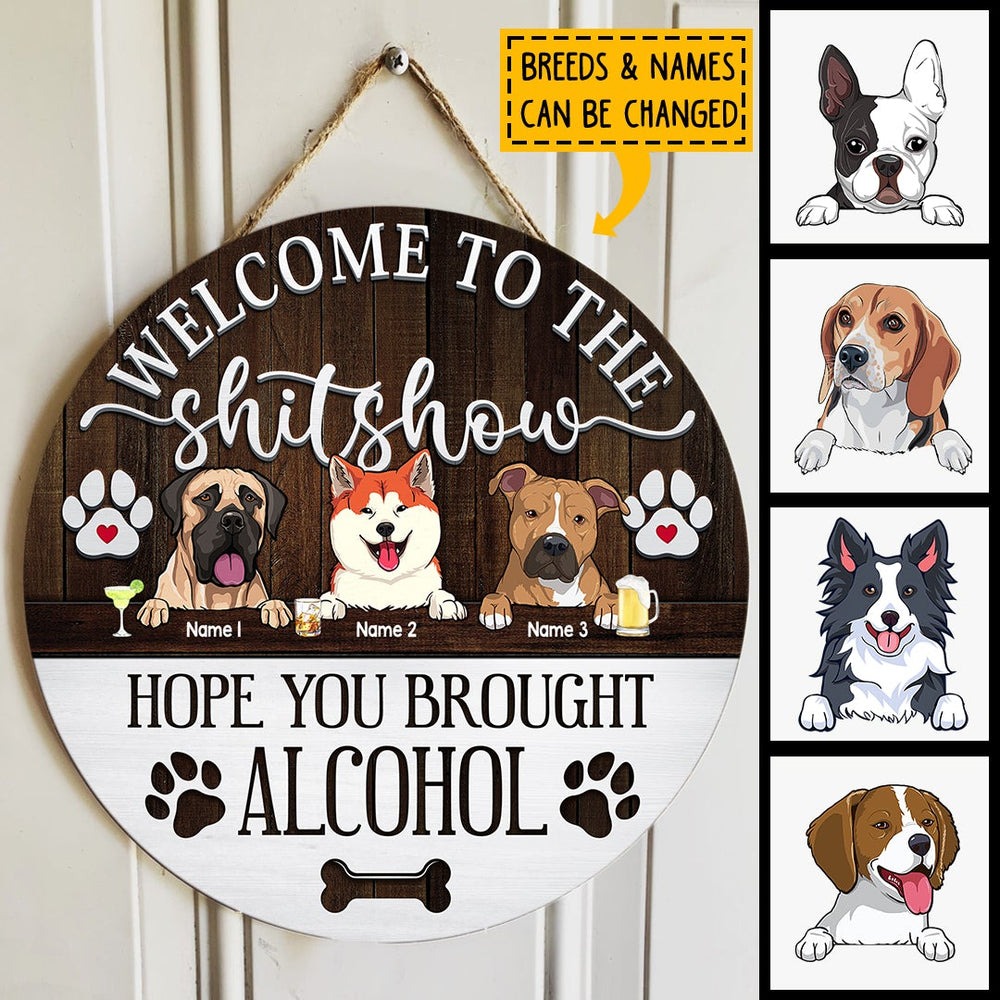 Welcome To The Shitshow, Welcome Rustic Wooden Door Hanger, Personalized Background Color & Dog Breeds Door Sign